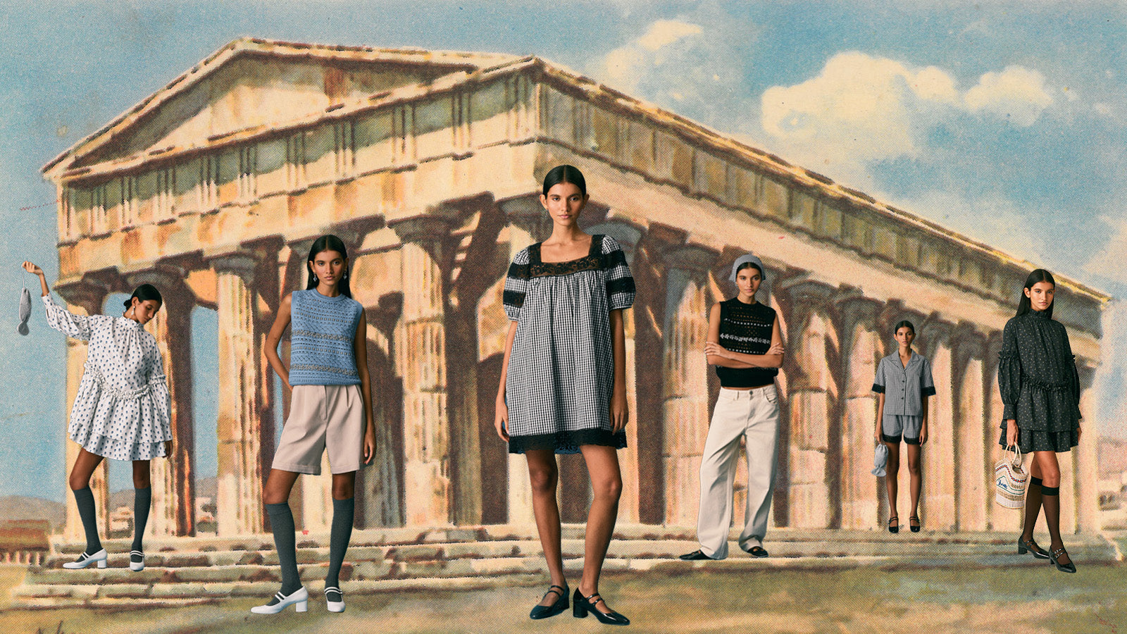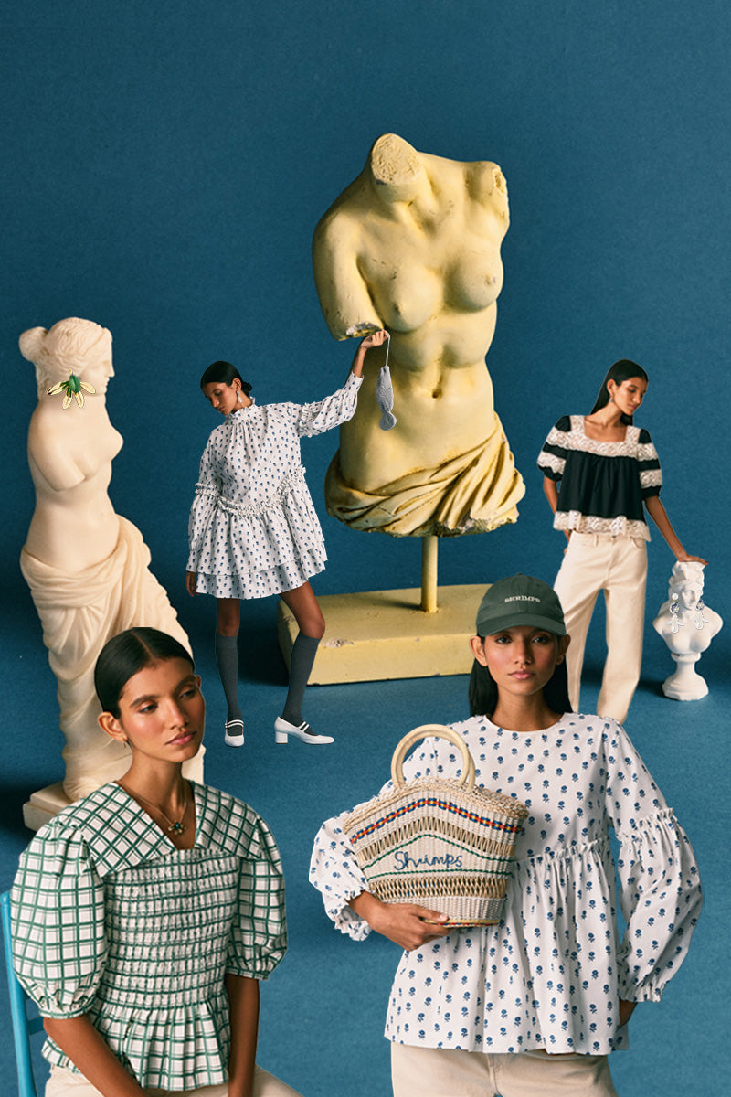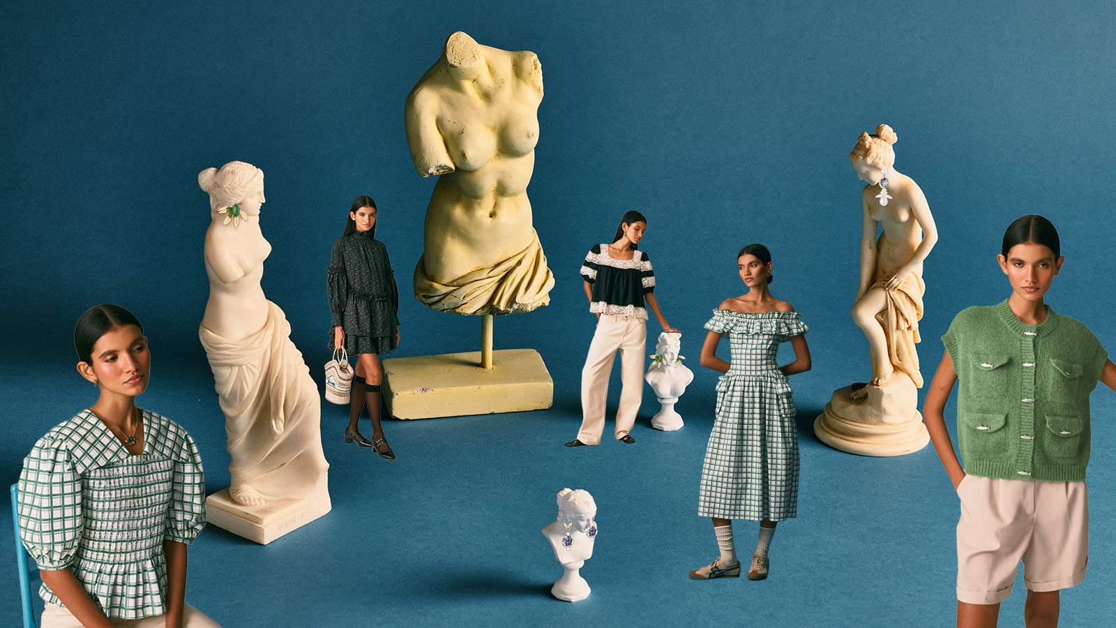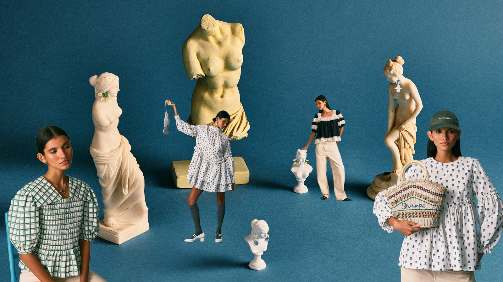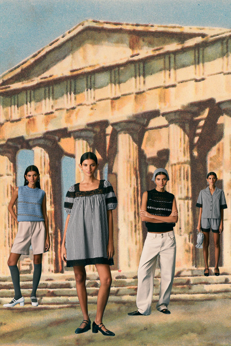 Inspired by the warmth of long summers spent on Greek islands, Spring Summer ’26 combines vintage florals, delicate lace, and Grecian motifs across lightweight cottons, heritage knits, and statement accessories.