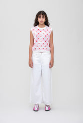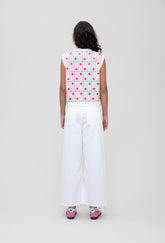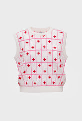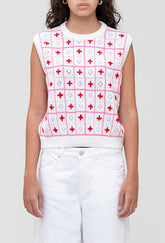 The Amara Vest comes in a light knit style with ribbed trims, a criss cross design and adorned with rows of contrasting flowers.