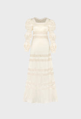 The Marie features a square neckline, gathered bust, long tiered puff sleeves, a hidden side zipper and finished at floor length.