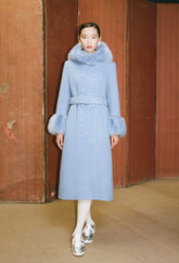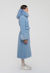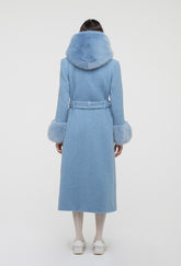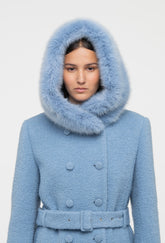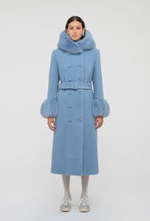 The Dallas features a double-breasted design, a luxurious faux fur hood (with a boucle inner) and matching exaggerated cuffs. Finished in a midi length, with covered buttons, two hidden pockets, two internal pockets, and an adjustable waist belt.