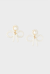 Introducing the Kiffin Earrings for Shrimps Bridal. In a classic stud design, the Kiffin Earrings feature miniature faux pearls crafted into a geometric bow with a large round faux pearl centre and rubber post backing. Thoughtfully gift wrapped in tissue and presented in a 'Shrimps' 100% cotton branded dust bag and recyclable branded gift box.