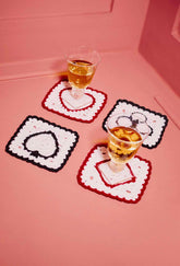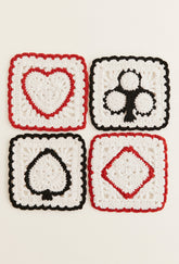 Introducing the Aces Coasters in collaboration with Reformation. Crafted from regenerative wool with an arctic base, and contrasting red/black embroidery. Finished with four statement motifs to resemble the different suits in a pack of cards.