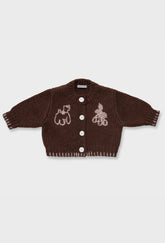 Introducing the Zeno Baby & Kids Cardigan for Autumn Winter '25. Crafted from super-soft merino wool, with a chocolate brown base and pale pink hand-embroidered motifs.