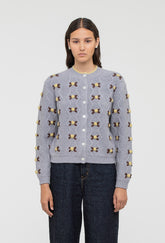 Introducing the Bloom Cardigan for Autumn Winter '25. Crafted from super-soft merino wool, with a pale grey base and dusty yellow hand-embroidered roses.