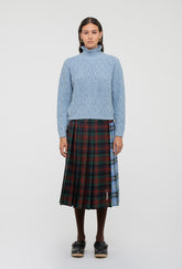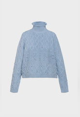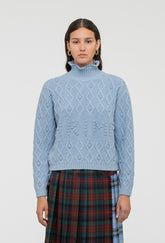The Cornelia features chunky cable knit detailing, a high ribbed neckline, cuffs and hem and is finished with a front rectangular panel with 'Shrimps' written in roses.