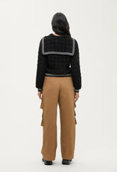 The Magic features a statement sailor collar, ribbed cuffs and hem, a pearlescent button-down front and allover open crochet detailing.