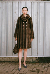 The Vincent features a double-breasted design with a notch lapel and distinctive stripes of vintage mink outerwear throughout. Finished at knee length with a hook and eye closure, two discreet side pockets and one internal pocket.