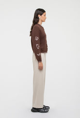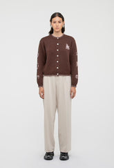Introducing the Hartley Cardigan for Autumn Winter '25. Crafted from super-soft merino wool, with a chocolate brown base and pale pink hand-embroidered motifs.