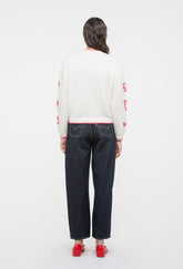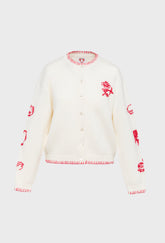 Introducing the Hartley Cardigan for Autumn Winter '25. Crafted from super-soft merino wool, with a cream base and rose red hand-embroidered motifs.
