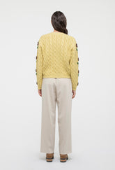 The Minnie features a button front-closure, cable knit detailing and a round ribbed neckline, cuffs and hem.