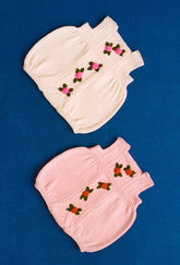 Introducing the Joa Baby & Kids Romper for Spring Summer '25. Crafted from super-soft merino wool, with a cream base and contrast hot pink/green hand-embroidered flowers.