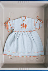 Introducing the Sia Baby & Kids Dress for Spring Summer '25. Crafted from super-soft merino wool, with a china blue base and rust hand-embroidered flowers and contrasting accents.
