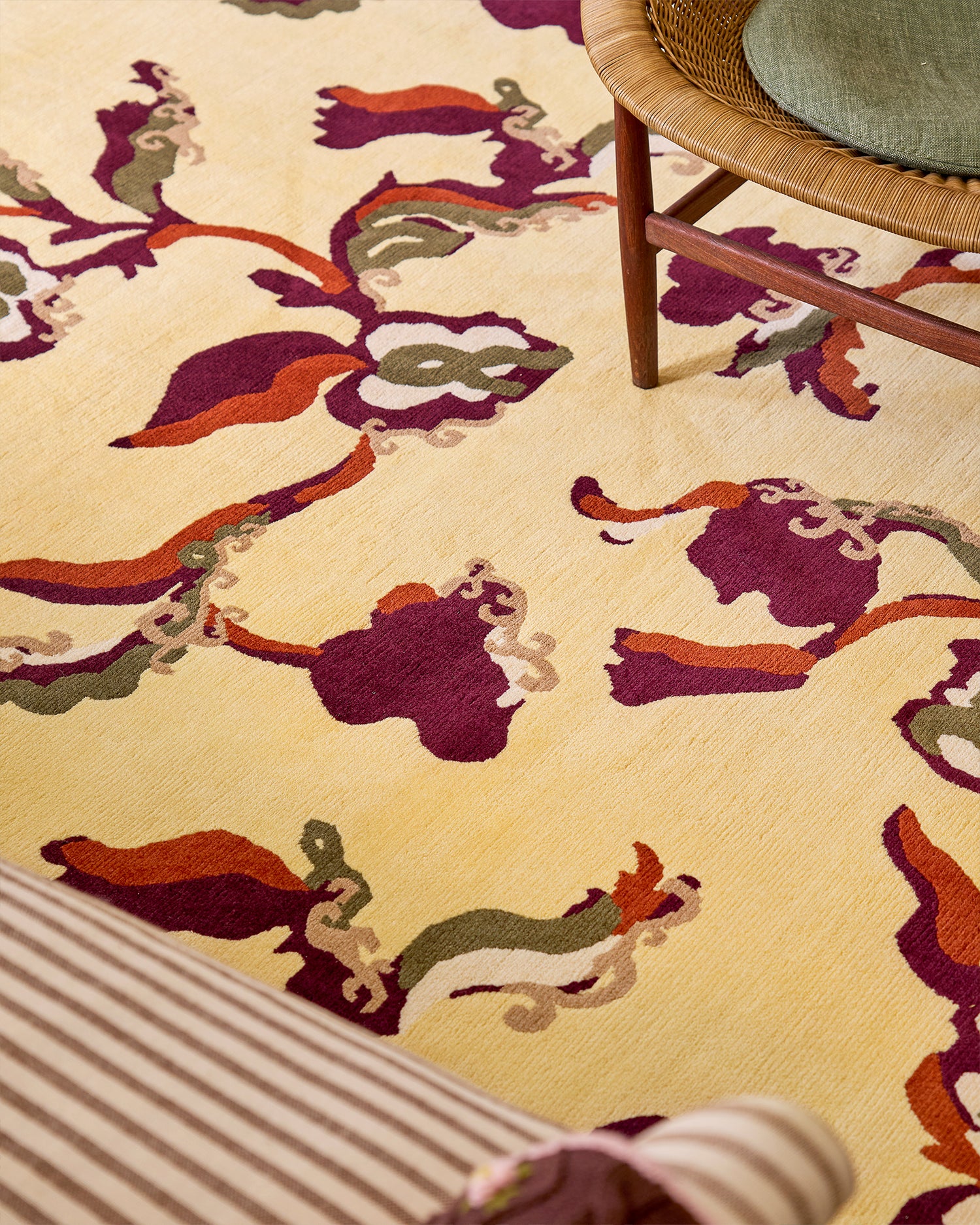 A soft butter-yellow hand knotted rug with a repeating floral motif, reimagined from a classic Shrimps archive print. Designed to evoke the feel of a fitted carpet, it brings warmth and charm to any space.
